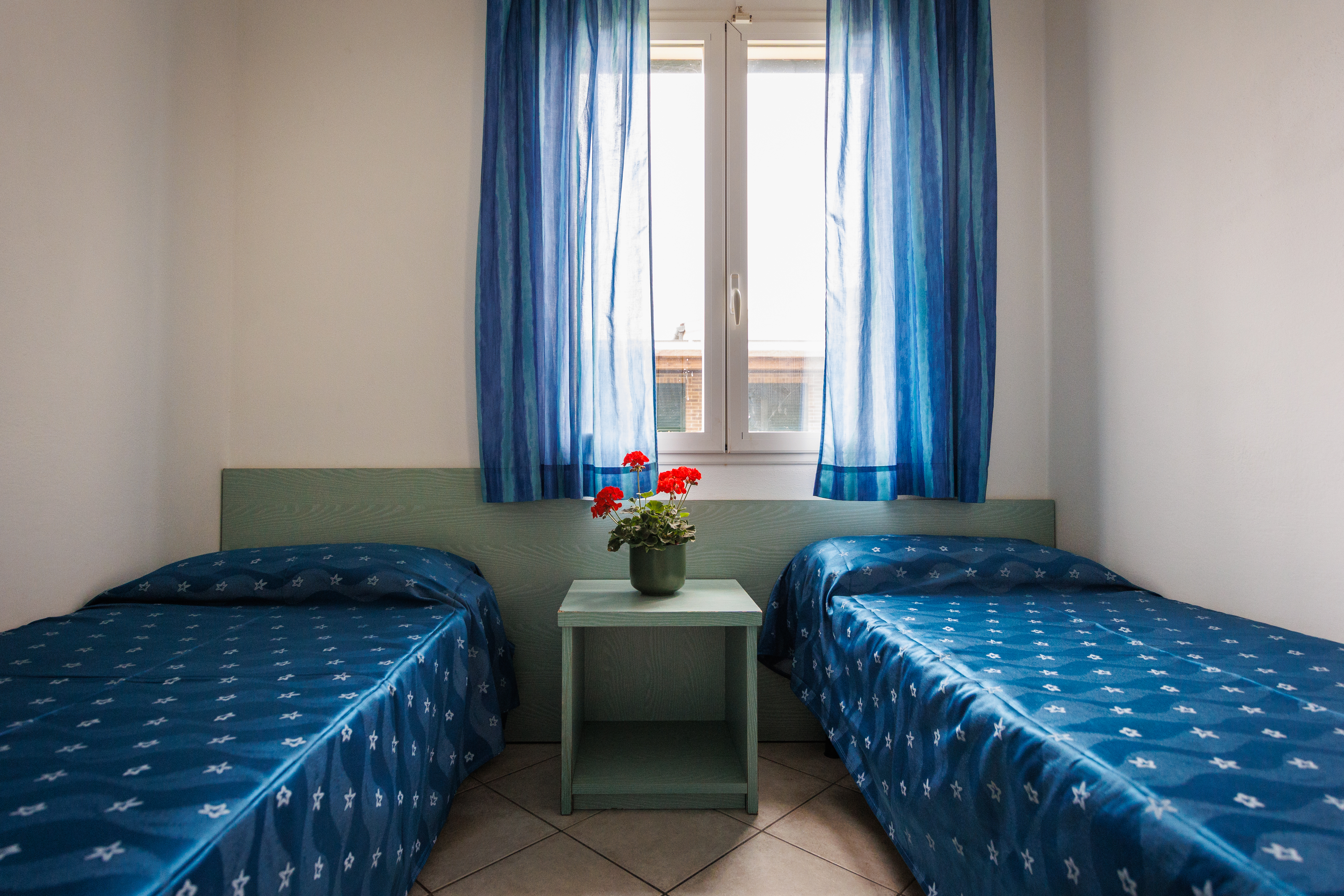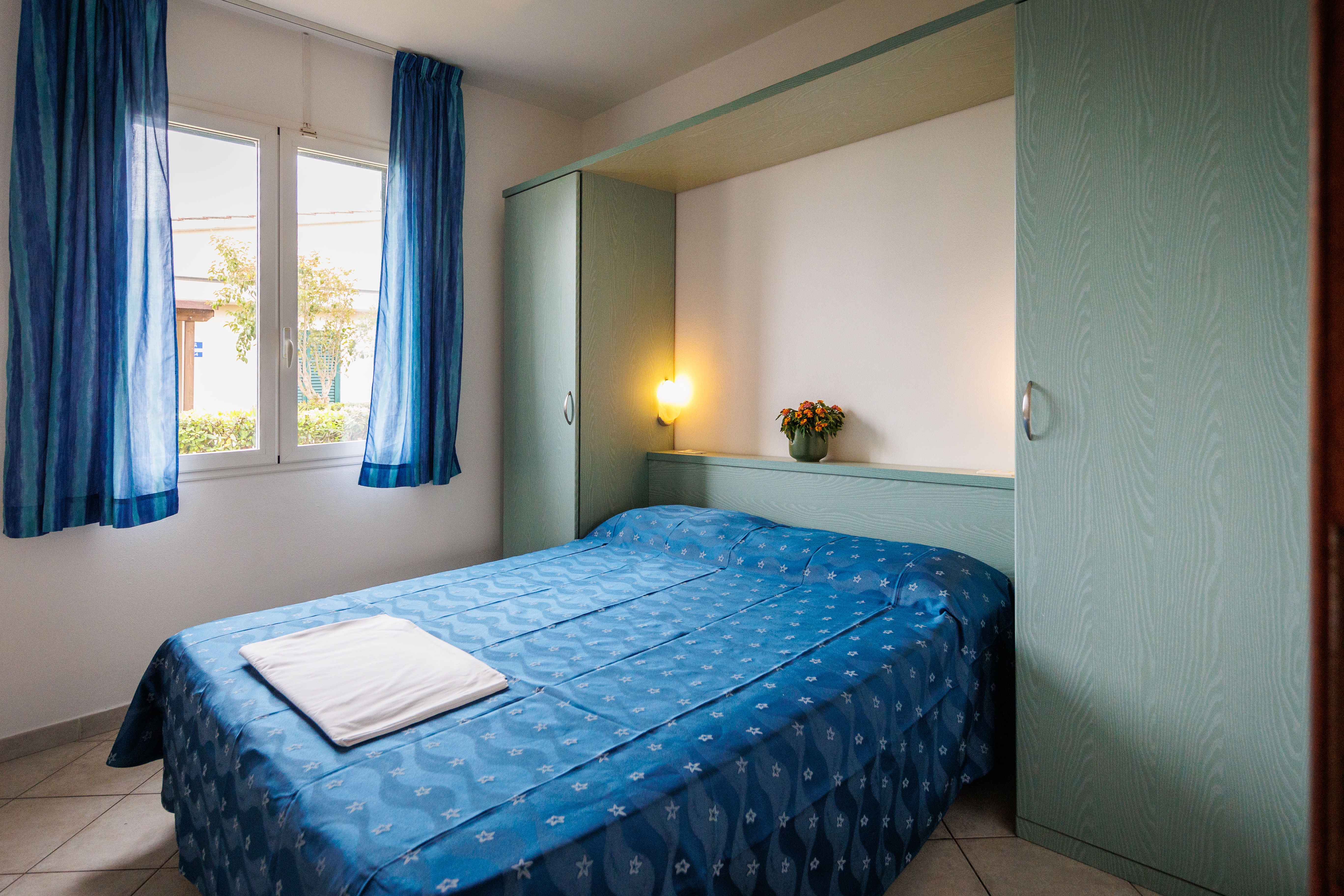 The 3-room bungalow on the first floor has: 1 living/bedroom with pull-out double couch, kitchenette, 1 bedroom with double bed, 1 small bedroom with 2 single beds, telephone, safe, 1 bathroom with shower, 1 equipped wooden terrace.